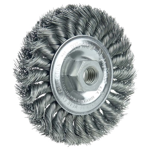 Weiler 4" Standard Twist Knot Wire Wheel Brush provides a heavy-duty brushing action with some flexibility for demanding deburring cleaning and surface preparation applications on somewhat irregular surfaces. 1/2"-13 nut for use on right angle grinders.